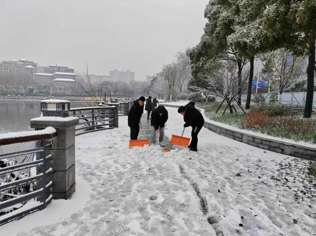 ? ? ? ?2月4日04時10分,武漢市氣象臺發(fā)布暴雪黃色預(yù)警信號。東湖綠道三期項目位于東湖南路,雙向兩車道,毗鄰東湖,道路臨水、彎多、路窄,一旦結(jié)冰行車時危險性極高。清晨6點半不到,項目部突擊隊員們在武漢大學凌波門集合,投入到緊張的鏟雪除冰行動。經(jīng)過近6個小時的與雪“共舞”,東湖南路凌波門附近積雪和厚冰被突擊隊一掃而凈。截至5日下午15時,為放鷹臺段人行通道420米、東湖南路3公里掃雪除冰,清理倒伏法桐一棵、沿線因雪壓落樹枝全部清理完畢,道路無結(jié)冰且通行狀態(tài)良好。